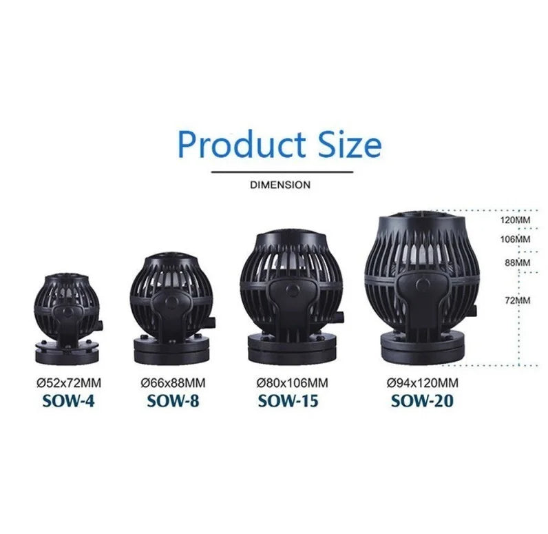 Cette pompe SOW-4 comprend un dispositif de commande qui peut se relier jusqu'à huit autres pompes des modèles SW sans fil.La pompe SOW4 peut varier de 500L/h à 4000 L/heure pour seulement 10 Watt 12 / 24 V. Les pompes esclaves peuvent être réglées individuellement, tandis que la pompe principale contrôle la fonction d'onde.